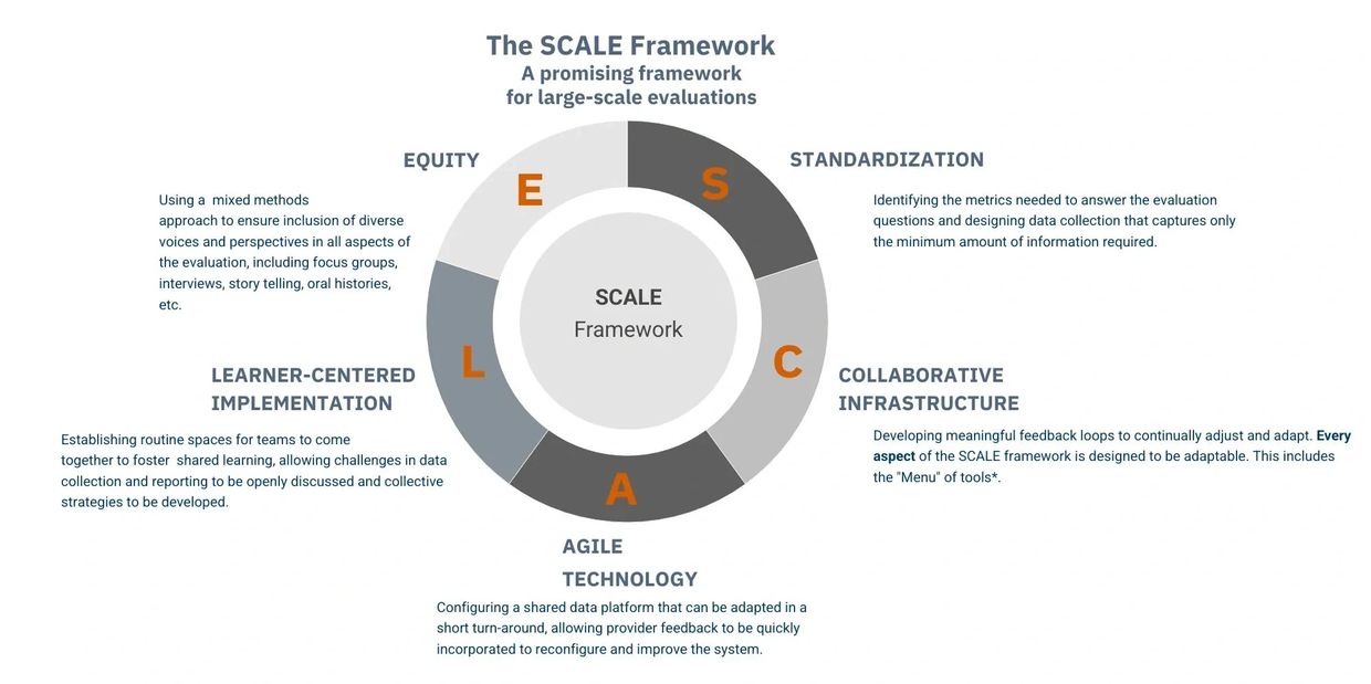 WHY SCALE? Evaluators often work with diverse providers who use different programs, tools, and outcome measures making it difficult to see the overall impact. SCALE creates a common data framework with shared metrics, consistent reporting, and aligned outcomes, while still allowing each program the flexibility to tailor data collection workflows, selections of approved measures and metrics. As a result, the initiative can tell a clear, credible story about impact.
